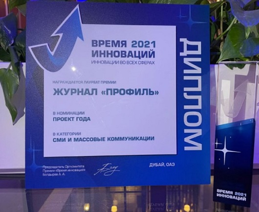 Еженедельный журнал «Профиль» одержал победу в категории СМИ и массовые коммуникации как лучший проект года. Жюри премии отметило рубрику «Деловой клуб», цель которой — рассказывать о переменах в работе крупных промышленных предприятий страны. В рамках проекта публикуются новостные и аналитические материалы о новых объектах, масштабных стройках, внедрении высоких технологий в разных отраслях, социальной политике, заботе о здоровье сотрудников, а также мерам по снижению воздействия производства на окружающую среду.