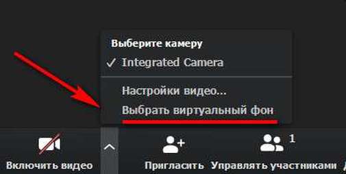 Чтобы включить функцию, на нижней панели возле значка видео жмем на стрелку, далее «Выбрать виртуальный фон».