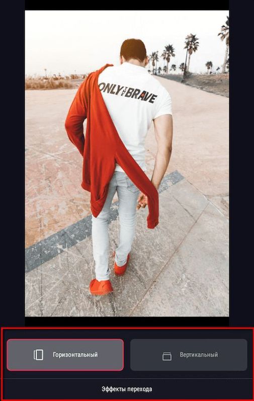 Внизу можно изменить музыку, добавить эффекты или изменить переход. Перехода всего 2 — горизонтальный и вертикальный.