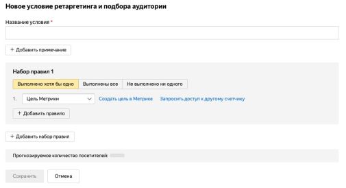 Можно указать не более 50-ти наборов правил в одном условии, объединенных оператором «И». В одном наборе можно создать до 250 правил. Для выполнения правил есть три условия: «Выполнено хотя бы одно», «Выполнены все», «Не выполнено ни одного». Для правильной настройки таргетинга нужно, чтобы в условии был хотя бы один набор правил с условиями «Выполнены все» или «Выполнено хотя бы одно».