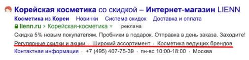 1. Только текст: заголовок, текст, ссылка на сайт, дополнительная информация — быстрые ссылки, расширения, контакты.
