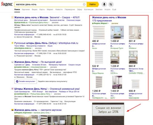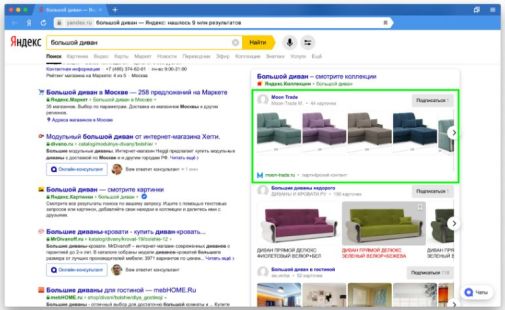 2. Текст + изображение. В большинстве случаев, это объявления в РСЯ. Если в объявлении указана цена, оно покажется в товарной галерее.
