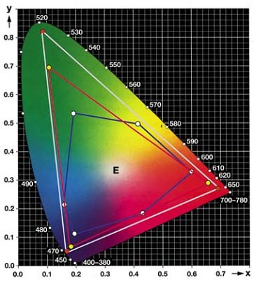 Рис.. Цветовой охват человеческого глаза (фигура целиком), высококачественного слайда (белый треугольник), монитора (красный треугольник), офсетной печати (синий многоугольник).