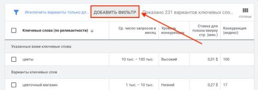 Шаг 4. Фильтрация. Чтобы уточнить список ключевиков, жмём «Добавить фильтр».