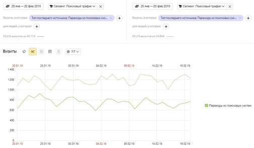 Данные о визитах интернет-магазина за два периода — до нормального поискового продвижения и через месяц после начала работ.