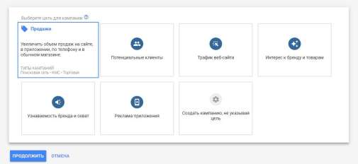 В Google Ads не нужно выбирать тип кампании — достаточно указать, какие цели должна выполнять реклама.