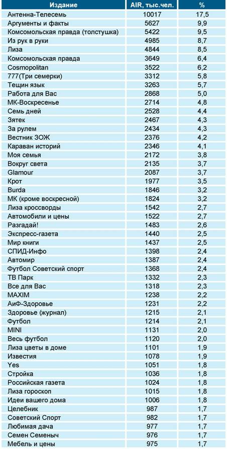Рейтинг дается по величине AIR (Average Issue Readership -средняя аудитория одного номера) в тыс. чел. и в процентах от населения России в возрасте от 16 лет и старше.